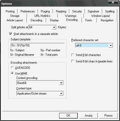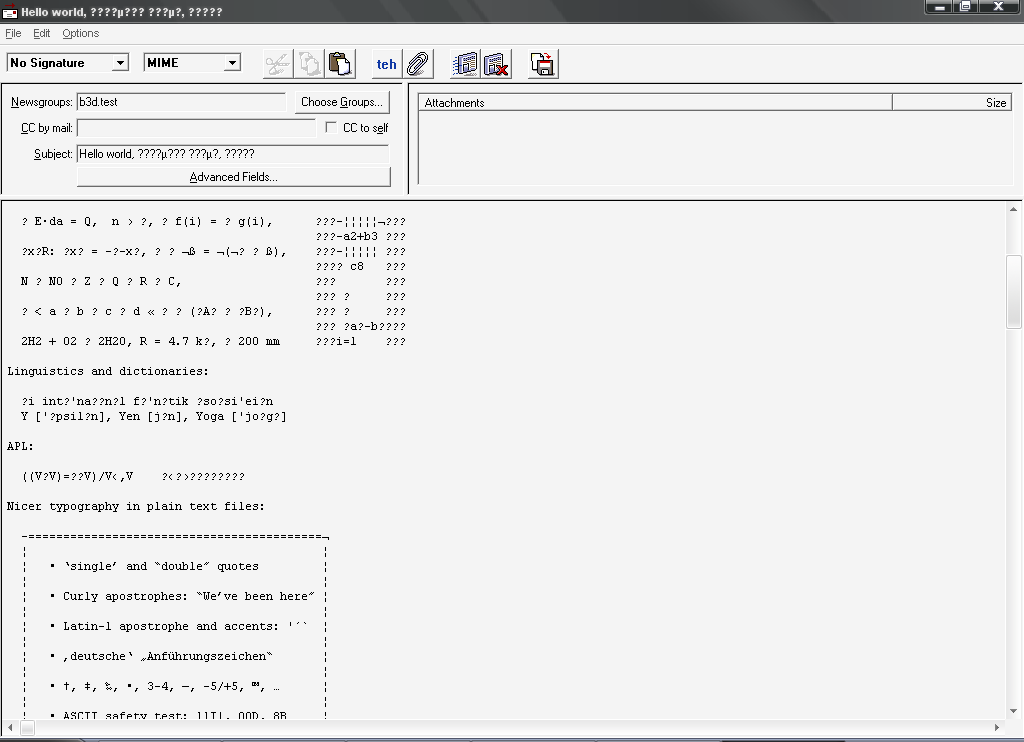 MPG niestety nie potrafi samo dobrać najniższego zestawu znaków w zależności od za zawartości danego postu. By domyślnie wysyłać posty W UTF-8 należy przestawić View → Global Options → Encoding → Preferred Character set na UTF-8