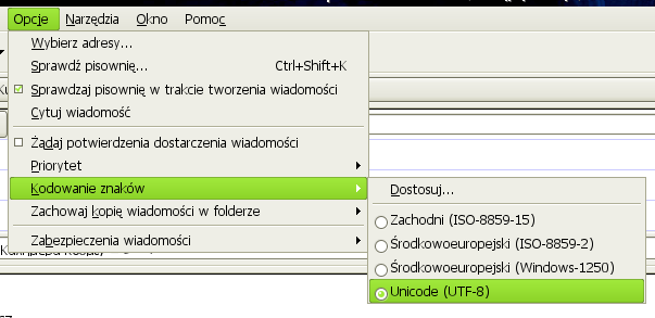 Ewentualnie możemy przed wysyłką wybrać z menu Opcje → Kodowanie znaków → Unicode (UTF-8)