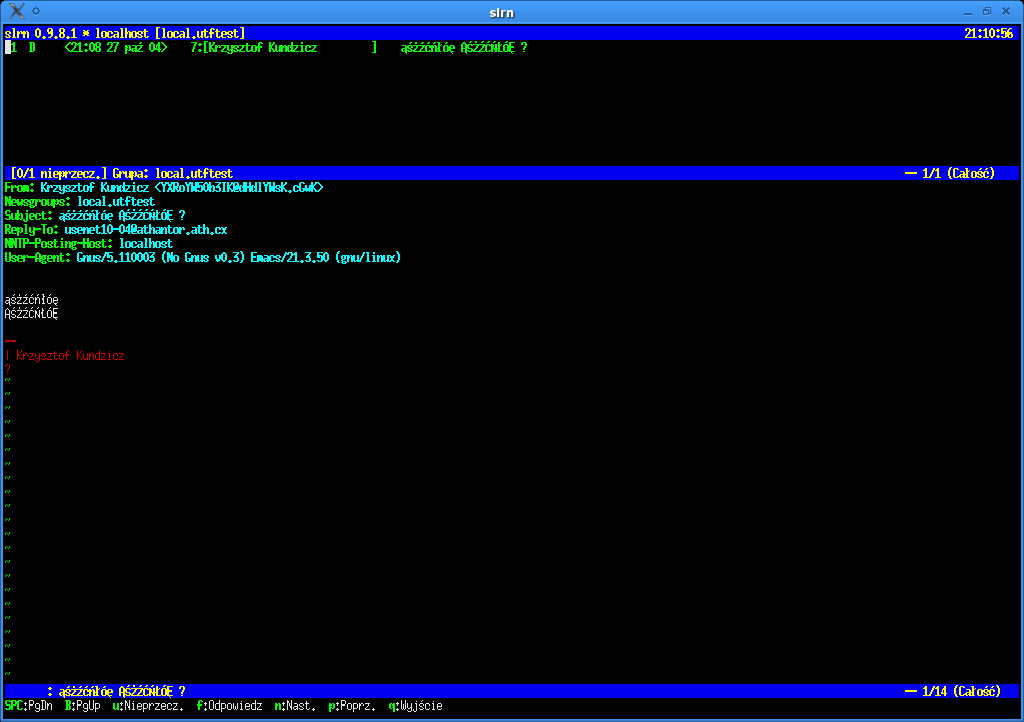 Slrn wyświetlający unikodowy post, Slrn wyświetlający polskie znaki diakrytyczne zakodowane w UTF-8, Slrn z makrem latin2.sl wyświetlający polskie znaki diakrytyczne zakodowane w UTF-8, Slrn 0.9.8.1pl2 na S-Lang 2.0.6 wyświetlający post w UTF-8.